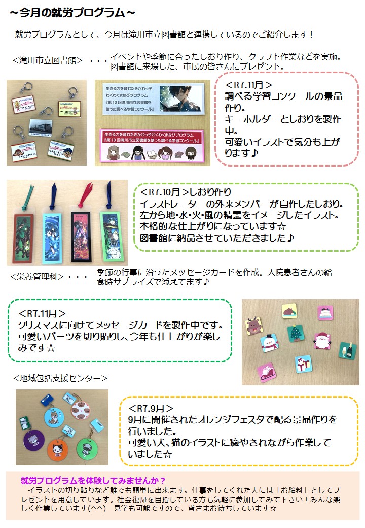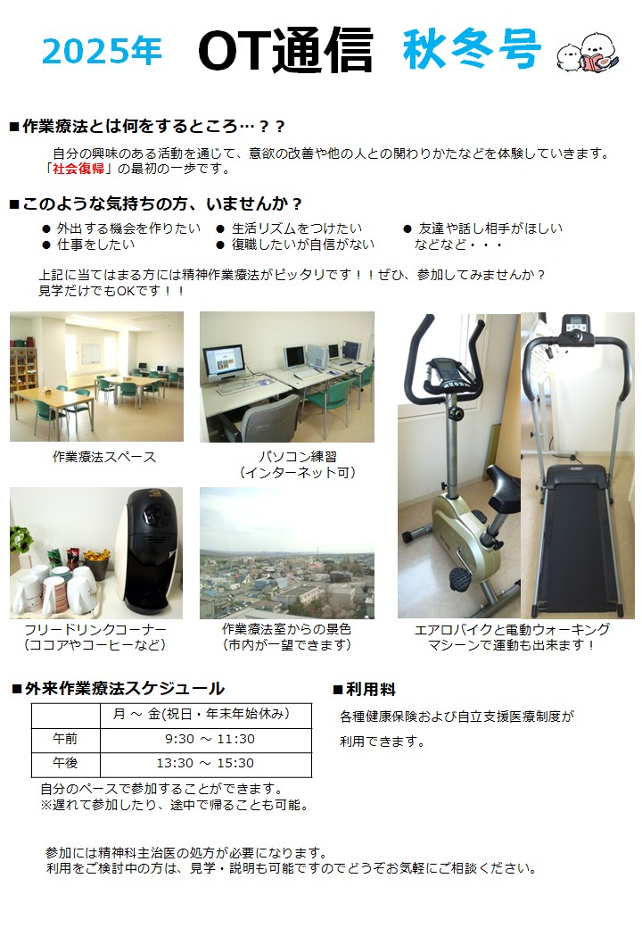 トップ ▼ トップ このページは、診療技術部リハビリテーション科が担当しています。 [お問合せ先] 滝川市立病院 診療技術部リハビリテーション科 電話0125-22-4311 内線1704 「OT通信 2025 冬号」を発行しました 当院リハビリテーション科では、作業療法を行っている患者様の作品や新たな取り組みなどを定期的に紹介しています。 今回は「OT通信 2025 冬号」が完成したのでお知らせします。【OT通信 最新号(2025 冬号)】 過去のOT通信は、こちら 最終更新年月日:2025.11.14